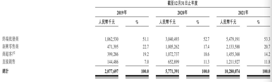 更值得注意的是,2021年,洪九果品營收的53.3%來自終端批發(fā)商,20.7%來自生鮮電商、社區(qū)團購等新興零售商,商超客戶占比14.2%,直銷占比11.8%。其中商超客戶明顯減少,而新興零售商的收入和占比都有一定的提升。而新零售模式,或許是洪九果品創(chuàng)造新機遇的渠道。