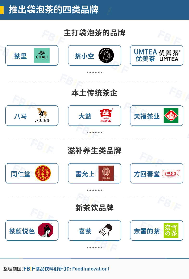 第一類是袋泡茶新品牌,包括茶里、茶小空、膠囊茶語及Chabiubiu等袋泡茶、茶粉及茶棒品牌;第二類是本土傳統(tǒng)茶企,八馬、大益及天福都已推出自己的袋泡茶產(chǎn)品;第三類是本土老字號,同仁堂、胡慶余堂、雷允上和吳裕泰,它們推出的桑葚枸杞茶、紅豆薏仁茶,區(qū)別于其他袋泡茶;第四類是新崛起的茶顏悅色、喜茶、奈雪的茶和蜜雪冰城在新式茶飲業(yè)務之外,增加了袋泡茶業(yè)務。