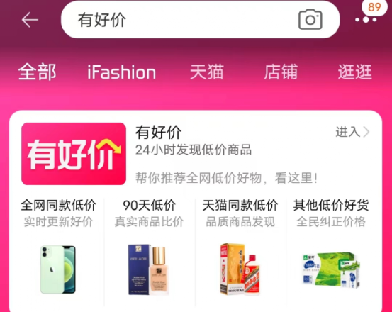 有意思的是,“有好價”頻道并沒有放在淘寶界面主頁比較顯眼的位置,在其它的熱門版塊區(qū)域也沒有設(shè)置入口,目前暫時只能在淘寶APP界面通過搜索欄,搜索“有好價”才能找到相應(yīng)的頻道入口。