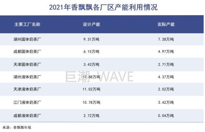 即飲類產(chǎn)品收入的不盡如人意,導(dǎo)致前期巨大產(chǎn)業(yè)投入的回報(bào)率嚴(yán)重不足。2021年,香飄飄固態(tài)奶的產(chǎn)能利用率平均達(dá)79.34%,仍然兢兢業(yè)業(yè)地扛起“家族重任”。而液態(tài)奶茶廠的產(chǎn)量利用率平均僅為18.99%,眾多廠區(qū)產(chǎn)能出現(xiàn)閑置,成了“不出活的新人”。