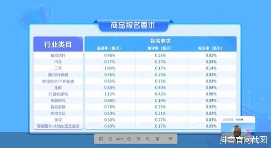 值得一提的是,抖音三大直播玩法的報(bào)名時(shí)間將持續(xù)至6月18日,據(jù)其工作人員介紹,滿足條件的商家可以隨時(shí)報(bào)名參與大促。與去年較為不同的是,今年抖音對(duì)參與“6·18”的商家設(shè)定了一定門(mén)檻。比如選入大促的“二手商品”的差評(píng)率需要低于0.17%,而食品飲料、美妝等的品退率不能超過(guò)5%。