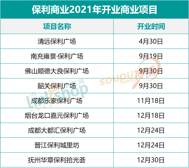 2021年,在聯(lián)商網(wǎng)統(tǒng)計的數(shù)據(jù)中,保利商業(yè)全年開業(yè)商業(yè)項目9個,且主要以保利廣場為主。整體上看,保利商業(yè)持續(xù)深耕大本營廣東區(qū)域,在佛山、清遠、韶關新開4座優(yōu)質保利廣場,充分顯示出保利商業(yè)的品牌聯(lián)發(fā)優(yōu)勢以及運營實力。