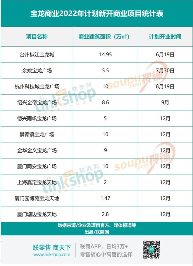 2022年寶龍商業(yè)將持續(xù)擴大市場規(guī)模,全年計劃新開11個商業(yè)項目,涵蓋了寶龍城、寶龍廣場和寶龍?zhí)斓氐犬a(chǎn)品。在完成2022年的開業(yè)目標后,寶龍商業(yè)離“雙百雙千”的目標更進一步。