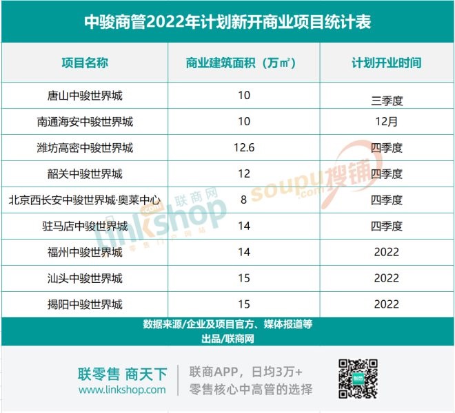 據(jù)聯(lián)商網(wǎng)零售研究中心統(tǒng)計,2022年中駿商管計劃新開商業(yè)項目數(shù)量也將擴大到9家,分布在北京、河北、山東、廣東、河南、福建等多個省市。