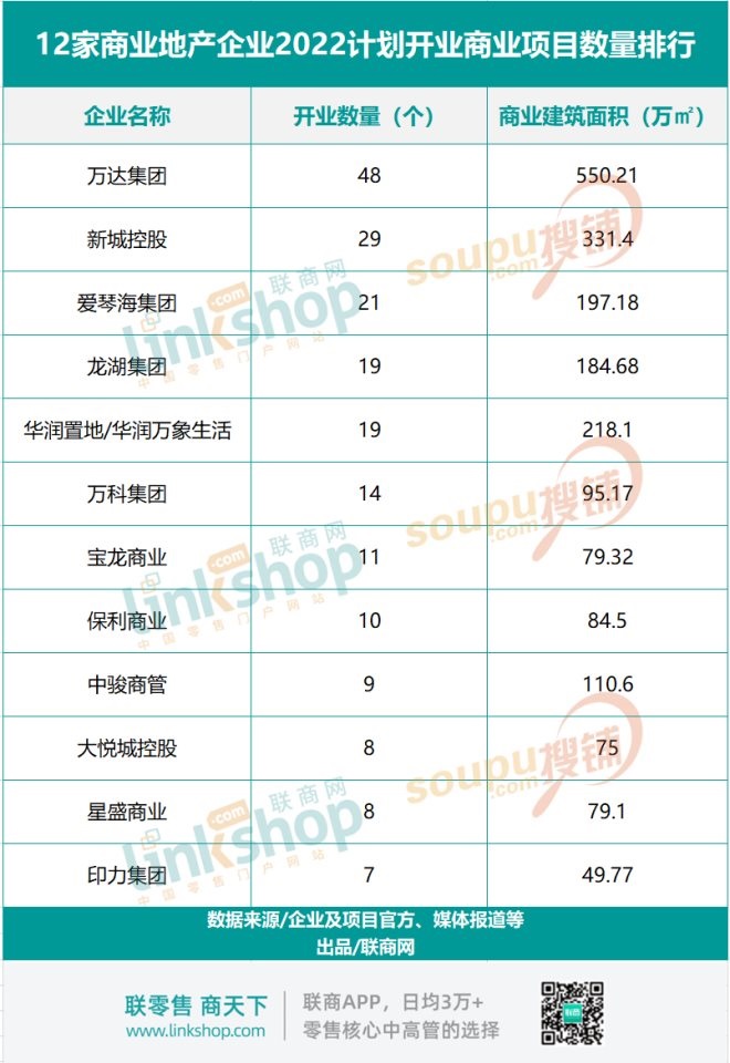 因此,聯(lián)商網(wǎng)零售研究中心統(tǒng)計了包括萬達集團、新城控股、愛琴海集團、龍湖集團、華潤置地/華潤萬象生活、萬科集團、寶龍商業(yè)、保利商業(yè)、中駿商管、大悅城控股、星盛商業(yè)、印力集團等12家頭部商業(yè)地產(chǎn)企業(yè)的2022年開業(yè)計劃情況,以管中窺豹,準確把握各大企業(yè)動向的同時,也能了解行業(yè)的發(fā)展趨勢。