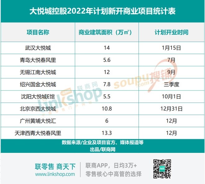 根據(jù)聯(lián)商網(wǎng)零售研究中心統(tǒng)計,2022年大悅城控股計劃新開商業(yè)項目數(shù)量達8個,包括了大悅城、大悅春風里等多個商業(yè)體,其中輕資產(chǎn)項目代表如紹興國金大悅城。