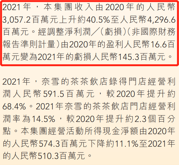根據(jù)奈雪2021年財(cái)報(bào)顯示,去年奈雪營(yíng)收約43億,增長(zhǎng)了40.5%,但也由盈轉(zhuǎn)虧,經(jīng)調(diào)整凈虧損達(dá)1.45億,典型的增收不增利。