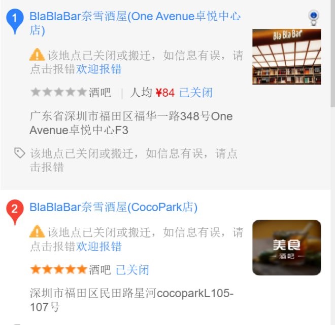 根據(jù)百度地圖顯示,BlaBlaBar奈雪酒屋也已有關(guān)門(mén)現(xiàn)象,BlaBlaBar奈雪酒屋卓悅中心店和福田星河COCOPARK店均已關(guān)閉。