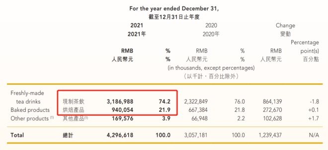 盡管也有布局酒類(lèi)和咖啡業(yè)態(tài),但這兩個(gè)業(yè)態(tài)并沒(méi)有成為奈雪的“第二支柱”,目前茶飲和面包依然是奈雪收入的重要來(lái)源。根據(jù)奈雪2021年財(cái)報(bào)顯示,現(xiàn)制茶飲和烘焙產(chǎn)品總共占到了總營(yíng)收的96.1%,其中,現(xiàn)制茶飲占大頭,占了74.2%。