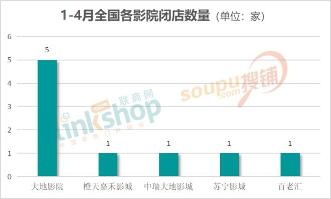 經(jīng)《聯(lián)商網(wǎng)》統(tǒng)計,截至4月底,全國已經(jīng)有9家影院閉店,其中大地集團旗下的橙天嘉禾影城、中瑞國際影城、大地影院均有閉店,共閉店7家,另外兩家分別為百老匯影城以及北京蘇寧影城。