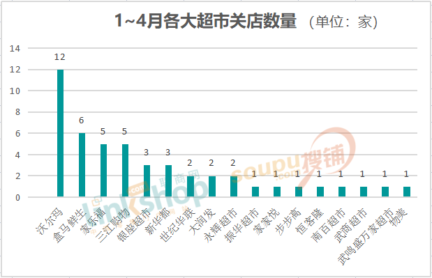 在2022年不足4個月里,已經(jīng)有48家超市閉店。其中沃爾瑪關(guān)店數(shù)量最多,閉店12家,占比約25%,其次是盒馬鮮生6家,占比約13%,家樂福和三江購物分別關(guān)店5家,占比均約10%。