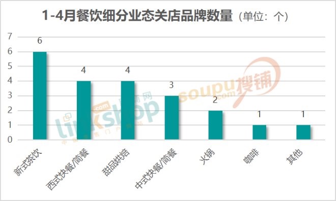 截至到4月底,餐飲業(yè)共計21個品牌、將近100家門店閉店。其中新式茶飲品牌閉店最多,共有6個,在21個閉店品牌中占比29%,甜品點心品牌和西式快餐/簡餐品牌均為4個,占比均為19%,中式快餐/簡餐品牌3個,占比約14%。