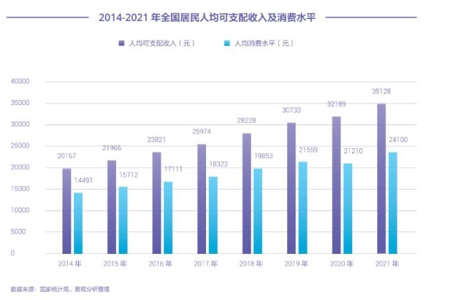 從需求端來看,這兩年國家出臺(tái)了多項(xiàng)措施刺激消費(fèi)、擴(kuò)大內(nèi)需。此外,國家統(tǒng)計(jì)局?jǐn)?shù)據(jù)顯示,2021年,全國人均可支配收入為35128元,同比實(shí)際增加8.1%,全國居民人均消費(fèi)支出達(dá)24100元,同比實(shí)際增長12.6%。