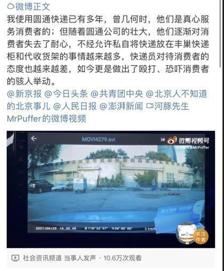 2021年2月,廣州消費者投訴當?shù)貓A通快遞積壓不派件,隨后記者前往該快遞站點了解情況,遭到站點工作人員暴力威脅,瘦弱的記者慘被工作人員鎖喉掐脖,險釀慘劇。僅僅半年后,也就是2021年8月25日,消費者李先生在在圓通速遞北京白紙坊分部自提快遞時,因要投訴工作人員態(tài)度惡劣遭遇對方威脅、想要拍視頻取證時遭遇毆打搶手機,截至其發(fā)布微博,沒有收到圓通方面的道歉或聲明。