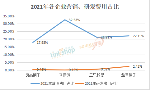 企業(yè)增收不增利,被“偷去”的利潤大多用在了營銷和不斷上漲的成本上。2021年,來伊份營銷費(fèi)用占比達(dá)到32.53%,而其研發(fā)費(fèi)用僅有503.1萬元,占比僅為0.12%。其它幾家情況也存在營銷費(fèi)用高企,而研發(fā)支出較低的情況。