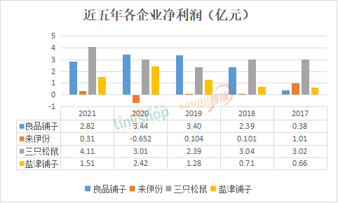 拉長來看,2017-2020年,來伊份營收同比增長分別為12.36%、7.01%、2.85%和0.59%,增速滑落明顯,2021年雖然增速有所提升,但也僅錄得3.63%的增長,仍然緩慢。從凈利潤來看,同期年凈利潤分別為1.01億元、1010.9萬元、1037.1萬元、-6519.54萬元。2020年凈利潤同比下降728.65%。
