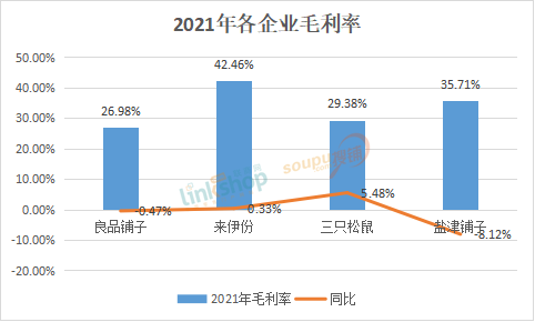 從毛利率來看,三只松鼠雖然在營收上處于第一梯隊(duì),但毛利率遠(yuǎn)低于來伊份和鹽津鋪?zhàn),略高于良品鋪(zhàn)印?021年良品鋪?zhàn)用蕿?6.98%,同比下降0.47%。