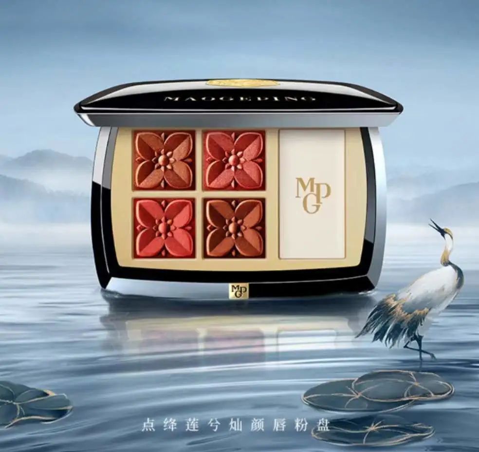 2021年雙十一,國產(chǎn)品牌毛戈平推出“故宮四季氣韻東方點(diǎn)絳蓮兮燦顏唇粉” ,其造型類似眼影盤,分為打底膏和四色唇粉兩部分,搭配唇刷來使用。一共有兩個(gè)色號(hào)盤,一盤11g,官方零售價(jià)580元。