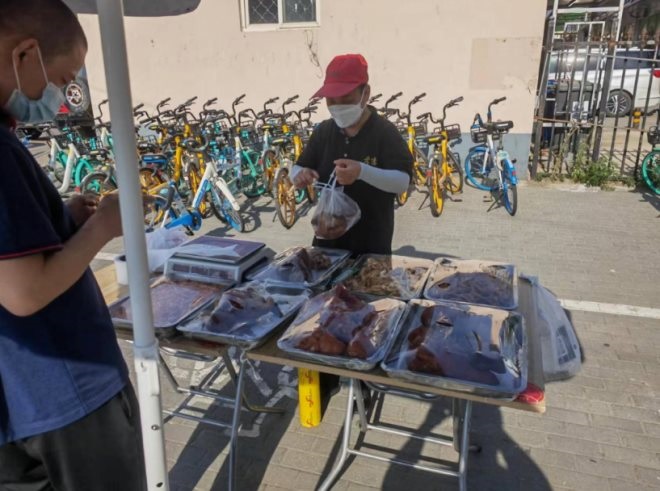 據(jù)在場的服務員介紹,他們上午和下午各一班輪換,輪換時就帶上下午需要售賣的熟食、涼菜和速凍餃子。據(jù)他表示,目前他們已經在周圍6個小區(qū)門口設點,由于熟食涼菜和速凍餃子都比較方便,讓居民也能在家放心食用,所以銷量都不錯。