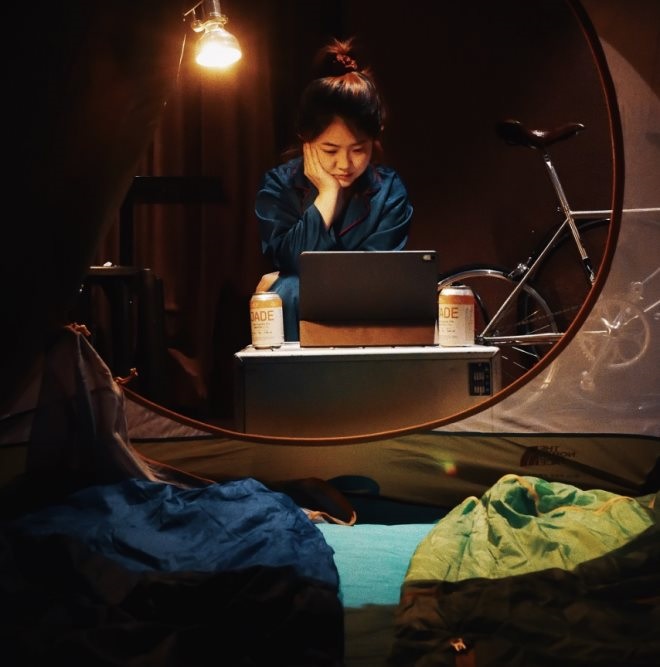 “現(xiàn)在,睡覺也習(xí)慣了各種機(jī)器聲,顧客送來的帳篷和睡袋,讓店里有了露營咖啡館的氛圍感!
