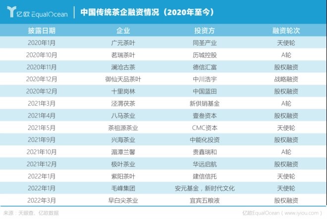 但相對(duì)于咖啡賽道的火熱,中國(guó)傳統(tǒng)茶企卻好似日漸沒(méi)落。天眼查數(shù)據(jù)顯示,2020年至今與傳統(tǒng)中國(guó)茶企相關(guān)的融資僅有14筆,拿到融資的有四川早白尖茶業(yè)、黃山毛峰茶業(yè)等。