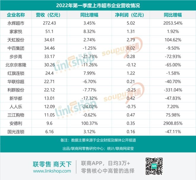 從整體上來看,一季度受疫情沖擊、物流限制、供應短缺、成本上漲等因素影響,部分超市企業(yè)營收、凈利增長未能達同期水平。