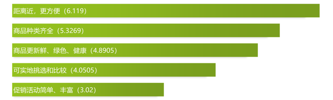 購物便利性、商品豐富度和商品新鮮、健康、綠色等主觀感受是影響消費(fèi)決策的主要理由,價(jià)格和營銷活動也會影響消費(fèi)者購買行為。