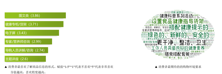 63.3%的消費(fèi)者購物時(shí)會注意商品信息提示,受影響程度受到收入、職業(yè)、是否有小孩和家庭角色等因素影響。消費(fèi)者更喜歡于圖文類信息,其次獨(dú)立的主題貨架或相關(guān)專區(qū)以及新媒體互動(二維碼、視頻等)。消費(fèi)者最希望的購物環(huán)境是綠色、新鮮、安全的。