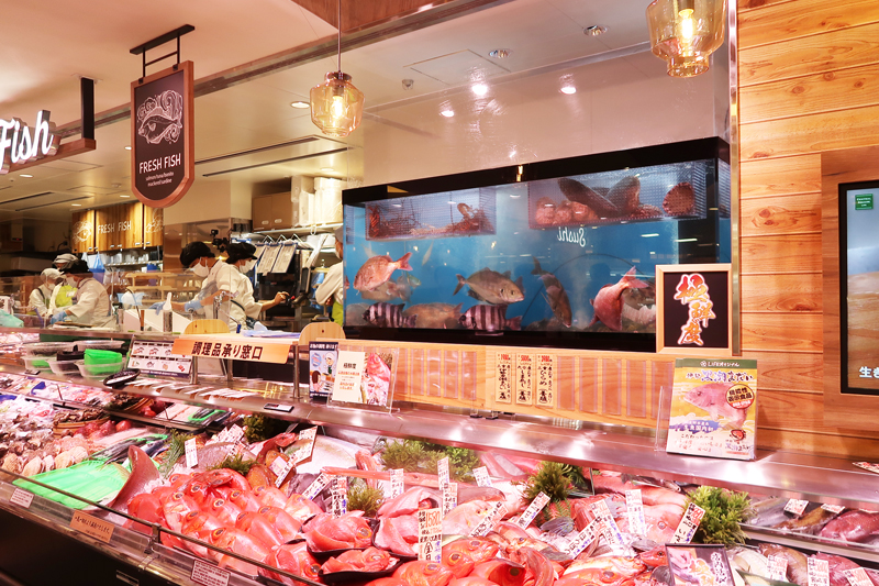 LIFE首次在首都圈的門店投入了1噸的活魚水槽,以極鮮的狀態(tài)提供水產(chǎn)品,打造區(qū)域No.1的水產(chǎn)賣場(chǎng)。壽司有獨(dú)立的賣場(chǎng)及加工間,與水產(chǎn)區(qū)用通道隔開,現(xiàn)場(chǎng)加工制作手握壽司、海鮮飯等。
