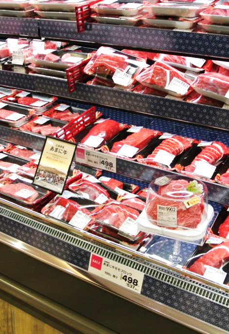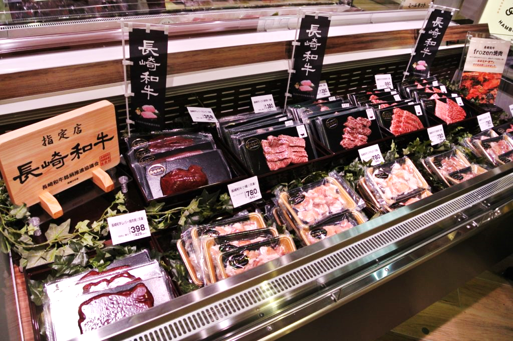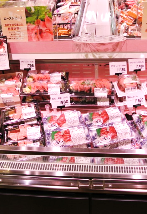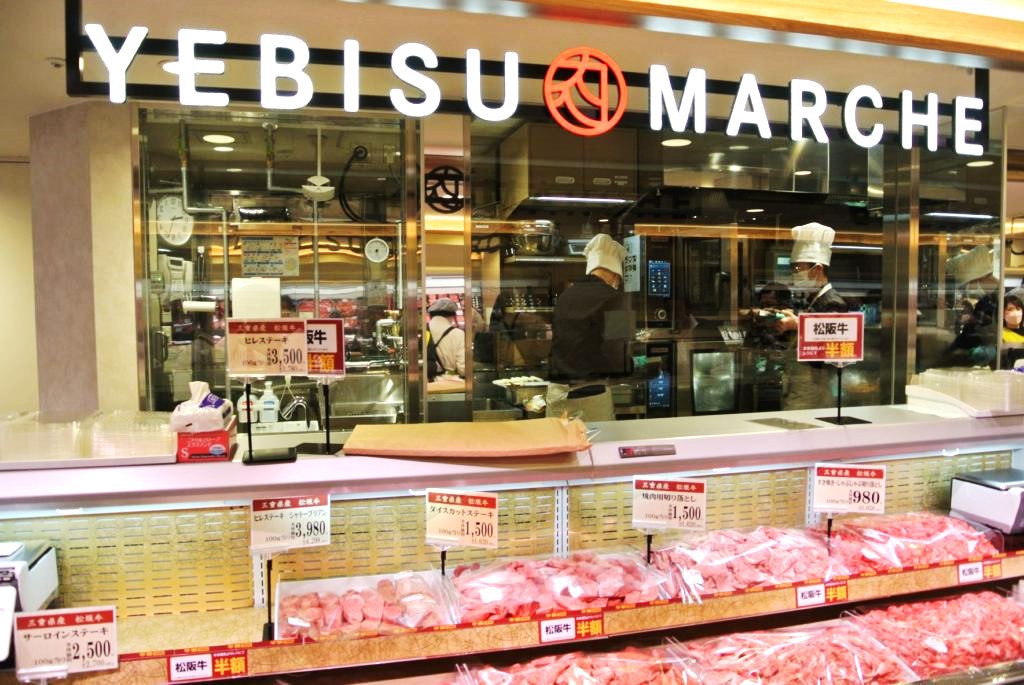 肉類區(qū)域名稱YEBISU MARCHE,經(jīng)營高端黑毛和牛“壹岐!薄布{黑豬肉、鹿兒島產(chǎn)地的品牌雞肉,高端牛肉采用稱重式銷售。開業(yè)當(dāng)天將知名度極高的松阪牛進(jìn)行半價(jià)銷售,吸引顧客來店。