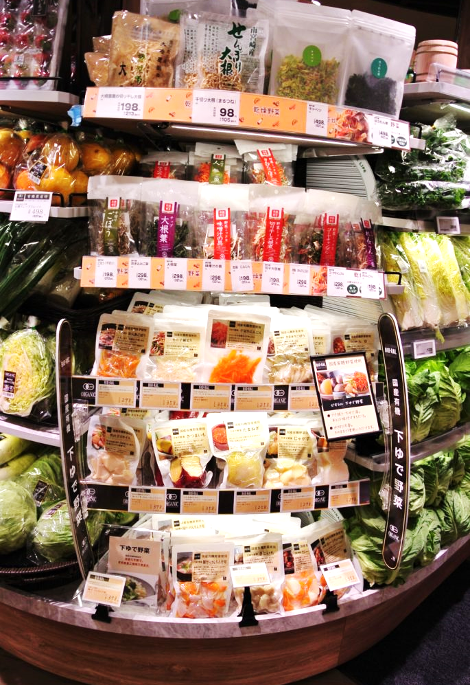 蔬果的面積是普通門店的1.4倍,增加有機(jī)蔬果、店內(nèi)水培蔬菜等新品類,擴(kuò)充店內(nèi)手工加工的沙拉、果切等的品項(xiàng)數(shù),包括100%使用有機(jī)蔬菜的沙拉。增加半成品預(yù)制菜,包括Oisix半成品菜(Meal Kit)、八百屋的半成品菜等。強(qiáng)化高端商品線,如5980日元的蜜瓜,3980日元的黑松露以及各種水果禮盒。