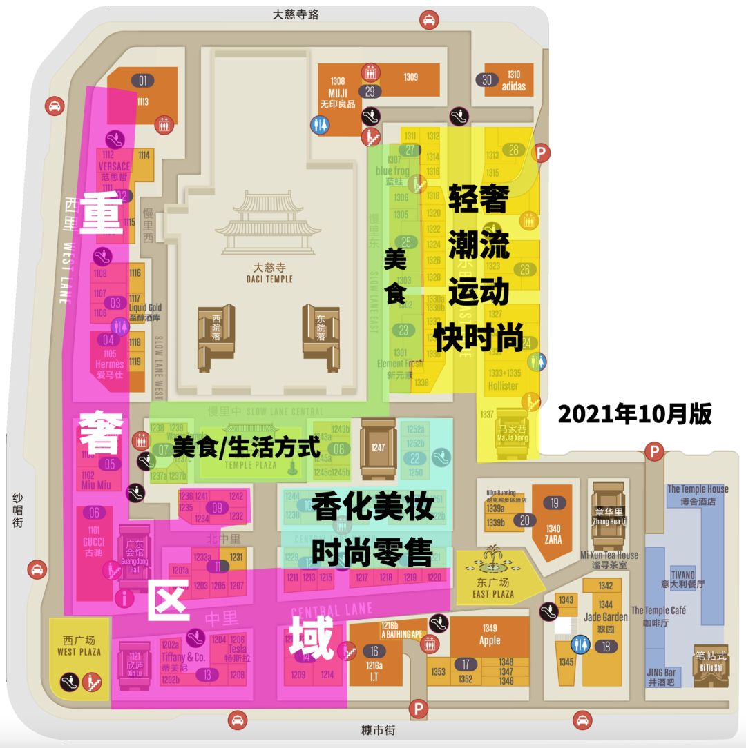 主干道中里和東里,則分別形成了重奢氛圍與輕奢時(shí)尚氛圍,東里部分香化美妝大概率會(huì)往北中里兩側(cè)聚攏;