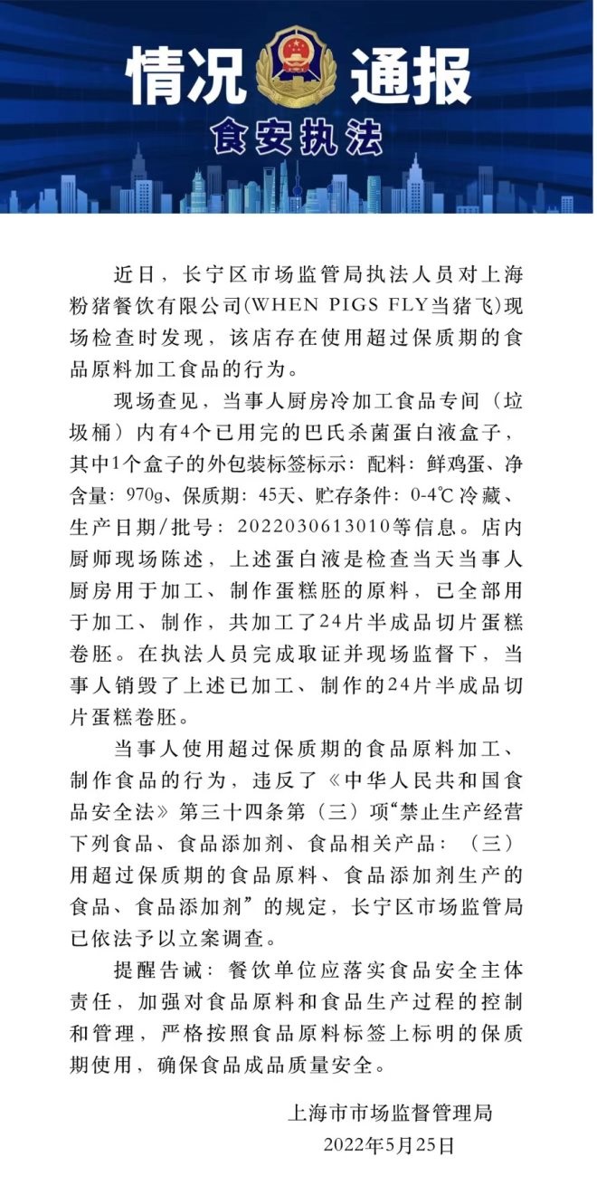 5月25日,上海網(wǎng)紅咖啡店“WHEN PIGS FLY 當(dāng)豬飛”因使用過期原料被立案調(diào)查。