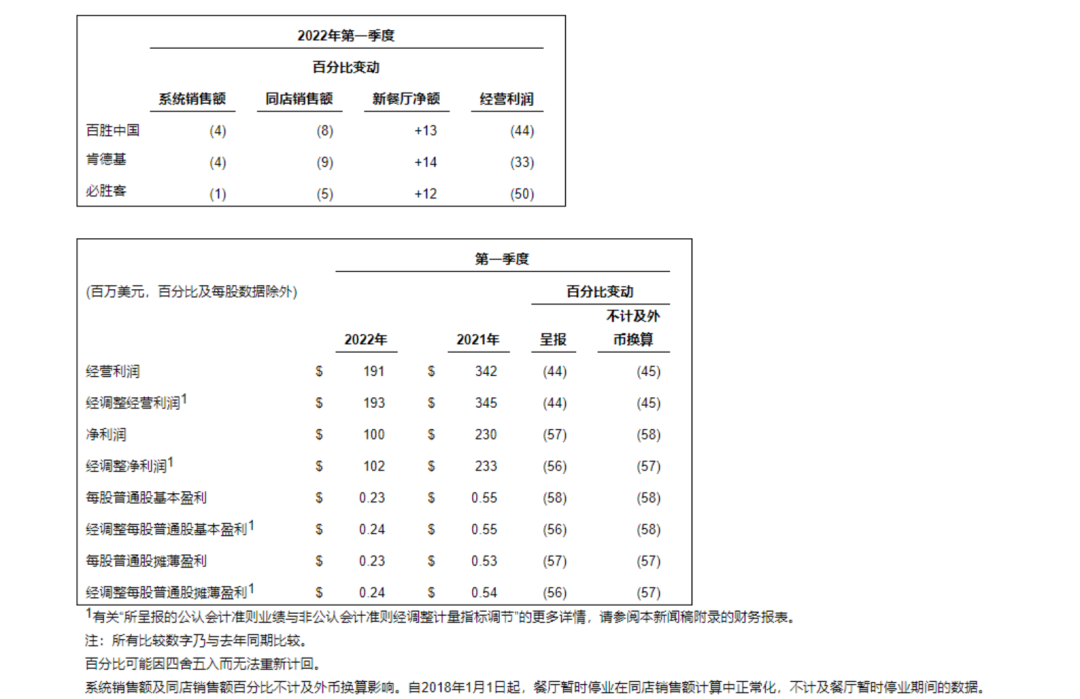 受疫情大環(huán)境影響,肯德基母公司百勝中國披露2022年第一季度業(yè)績。今年第一季度,公司總收入26.7億美元,同比(較上年同期)增長4%;凈利潤為1億美元,同比下滑57%。