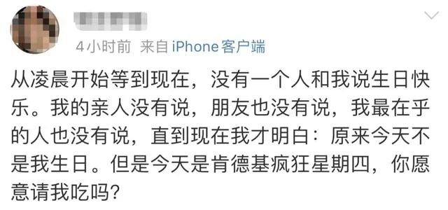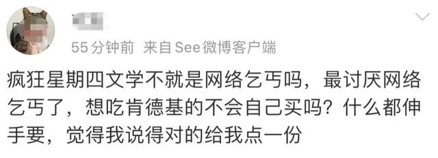 作為銷售端的促銷活動(dòng),“瘋狂星期四”的本意是讓利促銷,結(jié)果陰差陽錯(cuò)之下,成為了時(shí)下最熱的“互聯(lián)網(wǎng)新潮”,一些想吃肯德基的朋友們?cè)谛瞧谒陌l(fā)布一些魔幻且離譜的文案,并無一例外在結(jié)尾表達(dá)想讓別人請(qǐng)自己吃肯德基的愿望,被廣大網(wǎng)友稱為“瘋狂星期四文學(xué)”,又催生了一個(gè)新的族群“肯德基文學(xué)家”。
