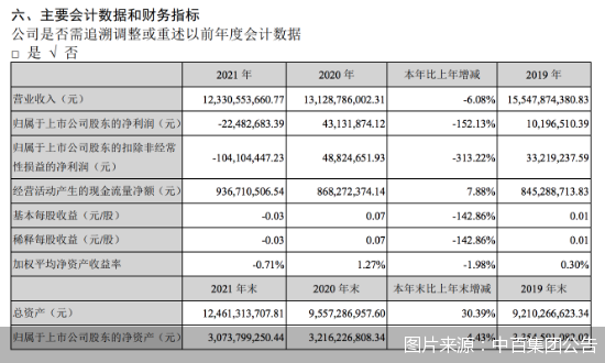 而在2021年,中百集團(tuán)出現(xiàn)營(yíng)收、凈利雙降,并出現(xiàn)虧損。財(cái)報(bào)顯示,中百集團(tuán)全年?duì)I業(yè)收入123.31億元,同比下降6.08%;歸屬于上市公司股東的凈利潤(rùn)為-0.22億元,上年同期為0.43億元,同比下降152.13%。2022年第一季度,中百集團(tuán)營(yíng)收34.46億元,歸屬于上市公司股東的凈利潤(rùn)為219.9萬元,分別同比下滑1.25%、9.50%。