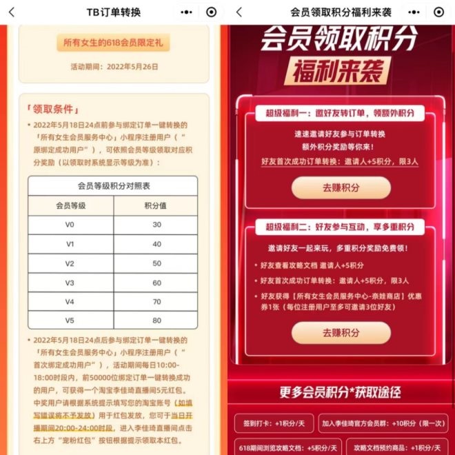 除此之外,小程序有消費者淘寶訂單一鍵轉化為積分,還有邀請好友查看618攻略領取積分,不僅可以把淘寶的粉絲引流到小程序,還能拉路人粉,精準積累客戶,逐步積累數據資產。而和社群的結合,則可以積累私域流量和粉絲粘性,把公域的流量導進私域。