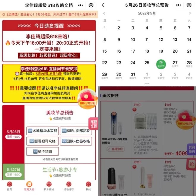 這款小程序是美ONE上線的一款直播輔助小程序,其中有李佳琦每次直播帶貨的產品清單,方便消費者根據需求篩選產品。這次618,消費者可以在小程序中使用“攻略文檔”,通過攻略文檔對待播的產品進行預約。當商品上播或者offer發(fā)生變化時,消費者可以收到提醒,并在小程序中就能夠生成預約清單,可以在準確的時間來到直播間購買產品。