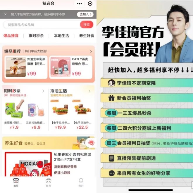 與早期用主播用個人IP“李佳琦Austin”的命名方式不同,小程序選擇了“鯨選”這樣和個人關聯(lián)度不高的名字來分散個人風險。