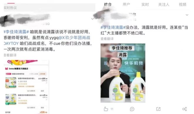 5月16日,李佳琦一邊帶貨威露士,一邊拉踩滴露。據業(yè)內人士分析,很有可能是滴露去年10月份簽約肖戰(zhàn)為代言人,沒有更多成本破價給李佳琦。隔天,#李佳琦滴露#登上微博熱搜,開始還有粉絲維護,不過很快評論區(qū)和熱搜詞條被肖戰(zhàn)粉絲攻陷,一方面,曬出李佳琦之前帶貨滴露時夸贊的視頻,另一方面,號召粉絲去滴露旗艦店下單,把戰(zhàn)火燒至李佳琦直播間。
