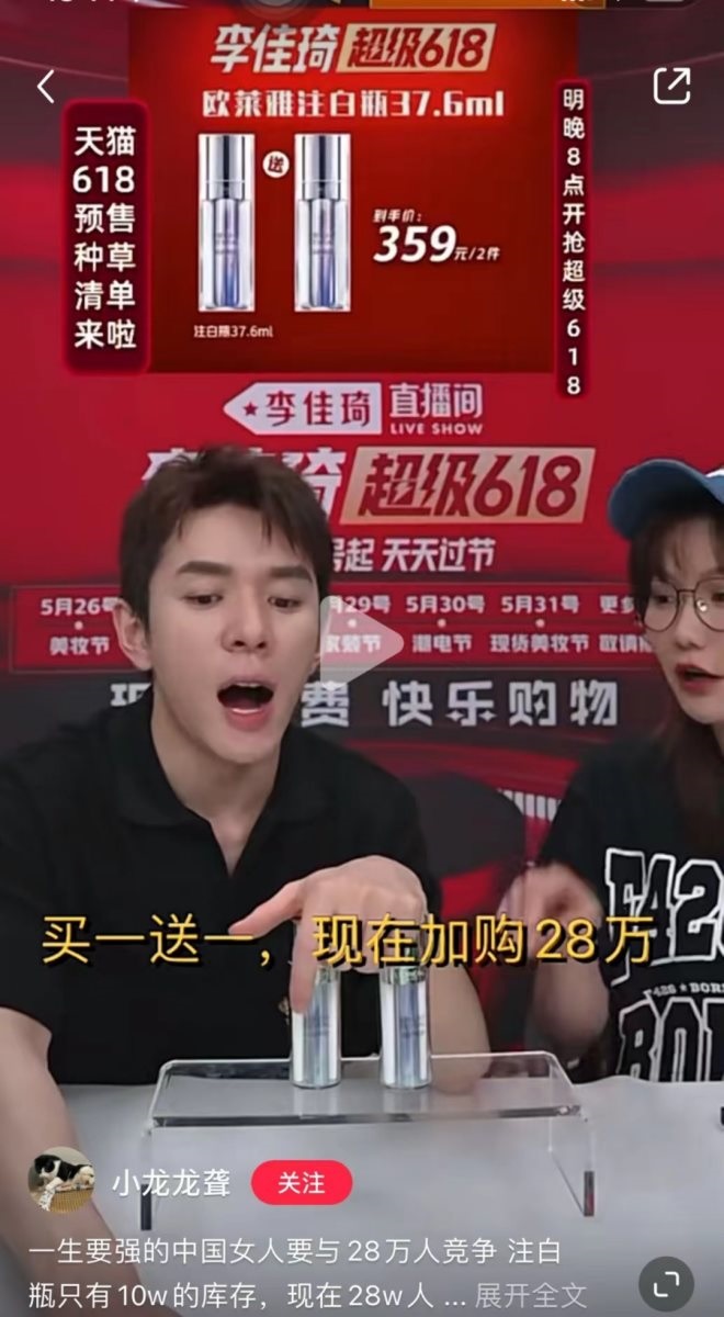 5月13日,李佳琦在618直播預告中展示了歐萊雅的爆款單品注白瓶,其官方天貓店售價439元,李直播間的價格是359元買一送一,并吆喝道:“它今年不火,我李佳琦把名字倒著寫”。