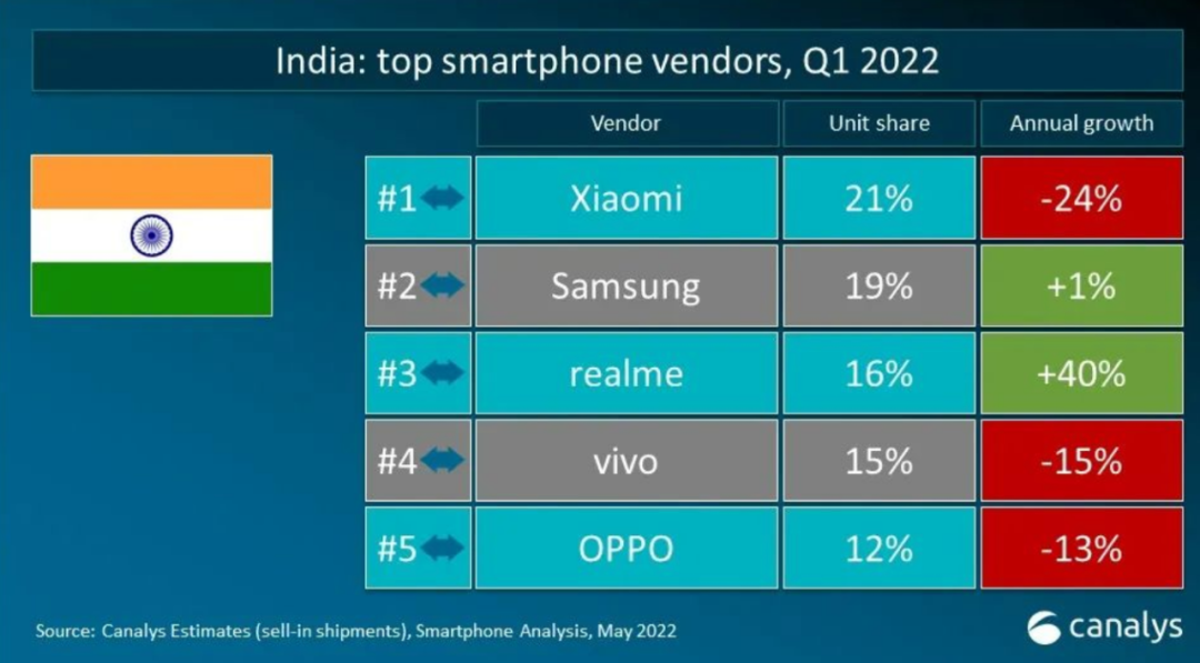 2022年第一季度印度智能手機市場出貨量及增長率,圖/Canalys
