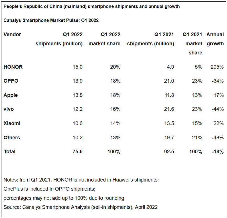 在該季度,榮耀自18個月前與華為分家后首次榮登中國市場的冠軍寶座,2022年Q1榮耀在國內(nèi)智能手機市場的市占率為20%,同比增長205%。蘋果則占有18%的市占率,同比增長17%。