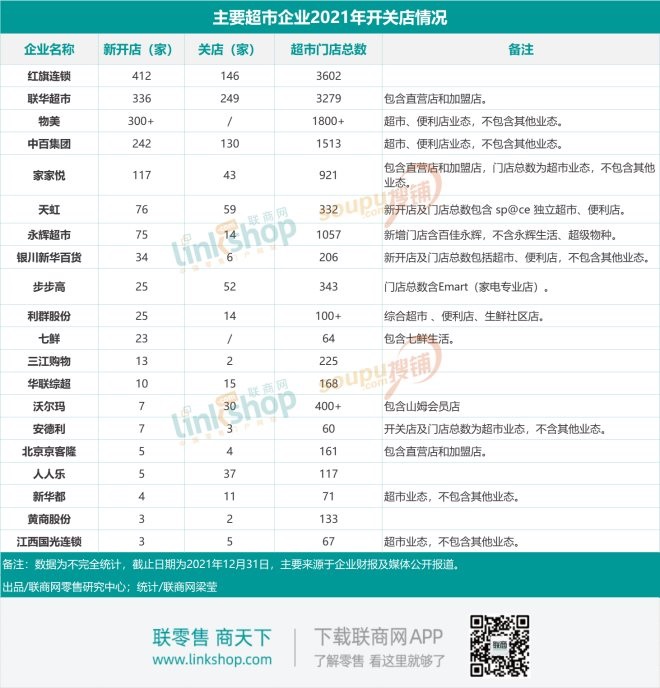 據(jù)聯(lián)商網(wǎng)零售研究中心不完全統(tǒng)計(jì),紅旗連鎖、聯(lián)華超市、物美、永輝超市、步步高、京東七鮮超市、沃爾瑪、人人樂(lè)、中百等20家超市企業(yè)2021年至少新開(kāi)門店1722家;同時(shí)至少關(guān)閉門店822家;截至2021年12月31日,20家超市企業(yè)門店總數(shù)至少達(dá)14619家。