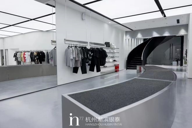 店鋪分為面向西湖,分為上下兩層,第一層主要是品牌服裝、飾品、鞋包、滑板試衣間。二樓是專享私密空間,擺放了超大品牌定制皮沙發(fā)、品牌十字花拜訪設(shè)置。