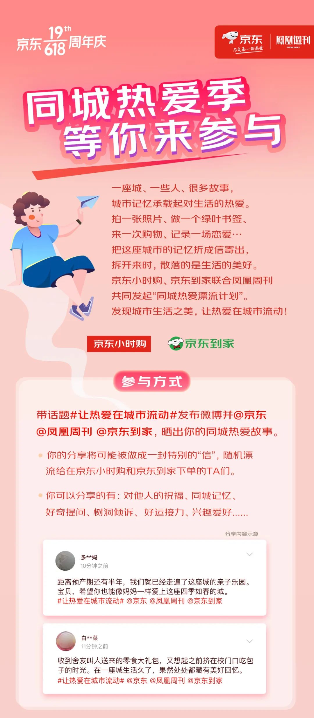 與此同時(shí),作為618同城好物節(jié)特別企劃,5月30日,京東小時(shí)購(gòu)、京東到家聯(lián)合媒體發(fā)起"同城熱愛(ài)漂流計(jì)劃",網(wǎng)友只要在微博話題#讓熱愛(ài)在城市流動(dòng)#下分享同城生活的熱愛(ài)故事,就有機(jī)會(huì)獲得禮品。