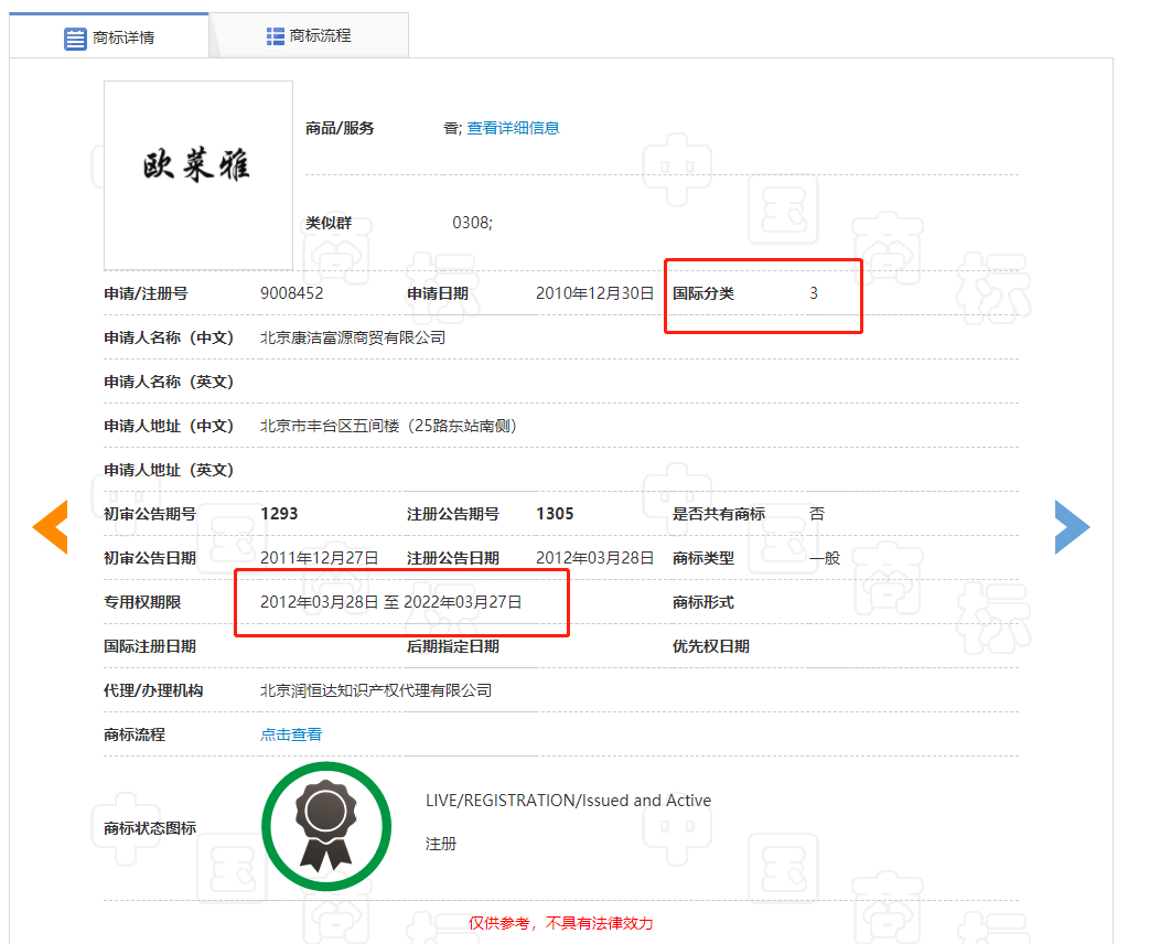 一字之差,謬以千里,甚至有侵權(quán)風險。據(jù)中國商標網(wǎng)顯示,配圖中被打錯的“歐菜雅”第3類化妝品商標已被北京康潔富源商貿(mào)有限公司申請注冊,商標專用權(quán)期限從2012年3月28日至2022年3月27日。