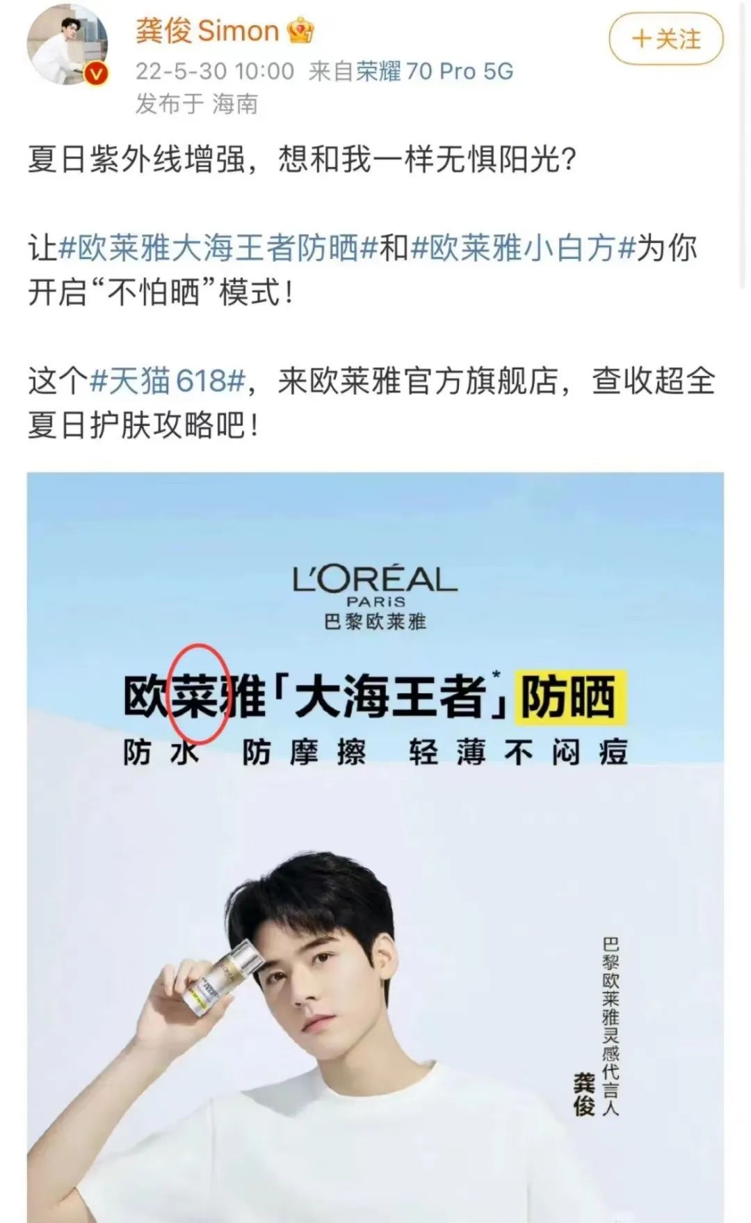 去年3月3日,龔俊作為巴黎歐萊雅防曬體驗官身份首次在微博上宣傳歐萊雅大海王者防曬產(chǎn)品。今年3月31日,龔俊從巴黎歐萊雅防曬體驗官升級為巴黎歐萊雅靈感代言人。
