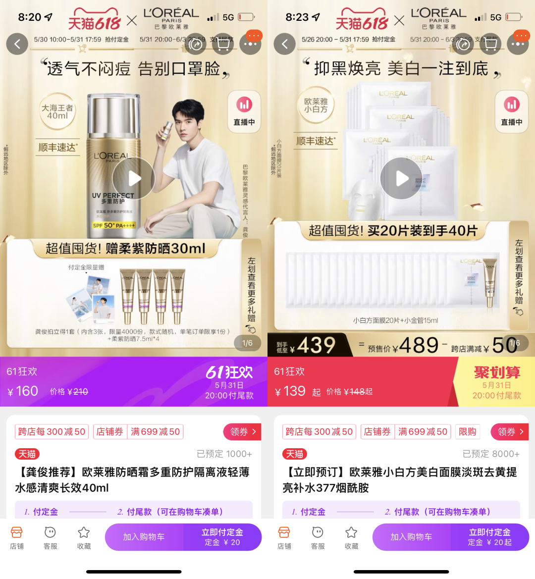 據(jù)悉,龔俊為巴黎歐萊雅代言的主要為兩款產(chǎn)品,即歐萊雅大海王者防曬和歐萊雅小白方面膜,其中歐萊雅小白方面膜宣稱美白淡斑功效,在本次618預(yù)售中,其天貓旗艦店預(yù)定量達8000+;歐萊雅大海王者防曬的預(yù)定量也超過1000。