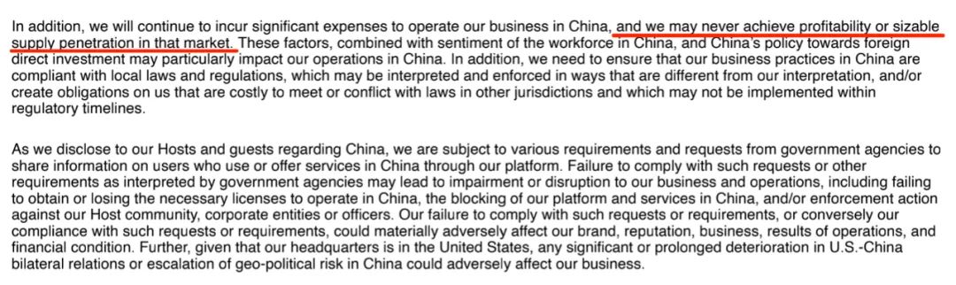 2021年財(cái)報(bào)中,愛(ài)彼迎Airbnb再一次表示,將在中國(guó)持續(xù)經(jīng)營(yíng)業(yè)務(wù)并產(chǎn)生大量費(fèi)用,這一次,愛(ài)彼迎Airbnb表示可能永遠(yuǎn)無(wú)法在該市場(chǎng)獲得盈利。